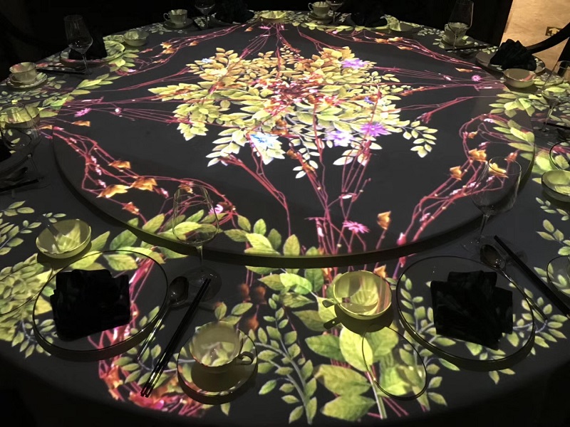 中餐新媒体互动桌面投影,北京南锣鼓巷,1000平方米四合院改造空间,地面投影,全息金字塔,定点投影,宋代绘画动态等各系统紧密协作;新媒体艺术不是炫技,是与经营和本地文化紧密相生的。